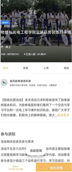 活动开始前,社团在到梦空间APP和qq空间进行宣传工作,学生可于5月4日至5月5日进行线上报名,鼓励同学积极参加。5月5日,会长王琦于活动群内发布相关活动事宜,活动于5月6日正式开始。活动过程中,学生在活动群中创建用自己“姓名+班级”命名的相册,用于上传每日训练照片进行打卡。活动期间,王琦要求参与活动的成员通过视频学习跆拳道太极一章的内容,并至少挑选三个动作进行练习,上传训练照片至个人相册,否则不予评奖。活动最后,学生在活动群进行签到,社团根据打卡情况评选出获奖者,将获奖名单在QQ活动群进行公示,活动结束。
