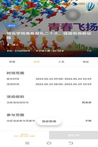 为了鼓励我院学生响应国家号召,积极参与到体育运动中去,5月23日到5月29日期间,我院大学生生命教育协会线上举办“物光学院青春献礼二十大,强国有我新征程”活动,本次活动由社团会长马云萍、副会长巩玉振主持。
