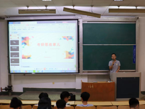 随后,在讲到考研流程时,他详细给大家介绍了,考研所考的科目、一般备考和考试的时间、如何查找目标院校及专业、考研国家线等有关考研基础知识。他提醒大家,目前大家已经处于大二尾声阶段,下半年即将开启大三生活,对于将来要不要考研要早做打算,提前进行谋划。讲解过程中他向大家分享了自己和周围同学的考研经历,鼓励大家若有考研心,一是选对方向,二是掌握方法,持之以恒一定能考研上岸。