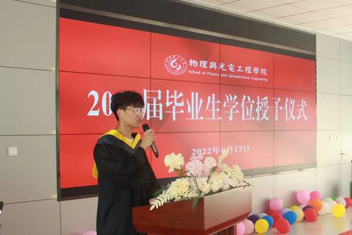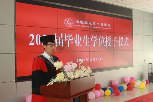 随后,毕业上代表光电1801班纪强同学发言,他回忆了自己在学校的求学和成长经历,他感谢学校学院在短短四年的本科生涯里给予他的平台,并表达了对母校、对学院、对老师们的感激与不舍之情和争做栋梁、报效祖国的决心。经过大学四年的培养,他成功考取山东大学攻读硕士学位。
