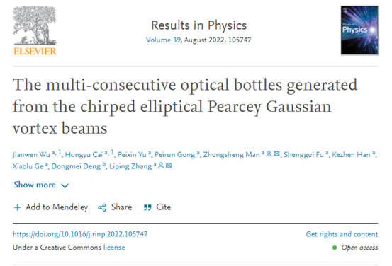 首位作者是大二学生吴建文,论文题为“The multi-consecutive optical bottles generated from the chirped elliptical Pearcey Gaussian vortex beams”,指导教师为青年博士辅导员张丽萍。