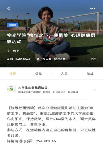为了鼓励我院学生保持积极向上的乐观态度, 4月21日到4月23日期间,我院举办“疫情之下,我最美”心理健康摄影活动,本次活动由大学生生命教育协会承办。