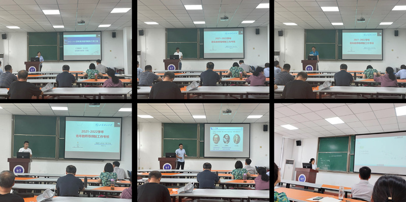 4位2021年新入职的青年教师准备充分,激情饱满,阐述了对助教课程的理解,梳理了助教工作开展情况,并对自己将要承担课程的教学内容片段进行试讲。考核领导小组对青年教师的助教工作及入职一年来各方面的提高给予了肯定,同时针对他们的授课方式、教学设计和教学方法、辅助手段等方面进行了精准的点评,对青年教师授课展示过程中存在的不足也给出了中肯的意见和建议。青年教师导师孙玉萍、周爱萍、尹广超、韩克祯分别汇报了一年来对青年教师的指导情况,并对指导的青年教师在课堂助课、科研情况、批改作业、批卷阅卷、实验教学、公共服务等各个方面情况进行了综合评价。