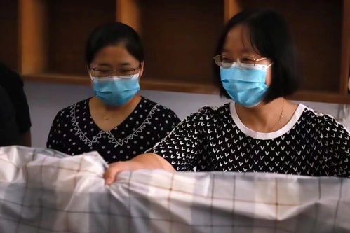 面对学院领导和老师们的到来,同学们在惊喜之余又倍感亲切。在探访过程中,遇到新生在装被罩,老师们亲切热情地帮助新生一起收拾,大家你一言我一语,小小的寝室里营造着温馨的氛围。