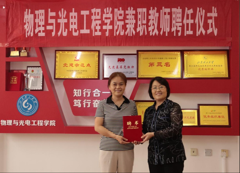 最后,学院在会议室举行了物理师范专业兼职教师聘任仪式,聘任周村区教研员胡青云为我院师范专业兼职教师。郑兆青为兼职教师颁发聘书并合影留念。胡青云表示,对受聘物理与光电工程院兼职教师感到十分荣幸,同时也感到责任重大,在今后的工作中将尽职尽责为学院师范生本科教学和人才培养贡献自己的力量。