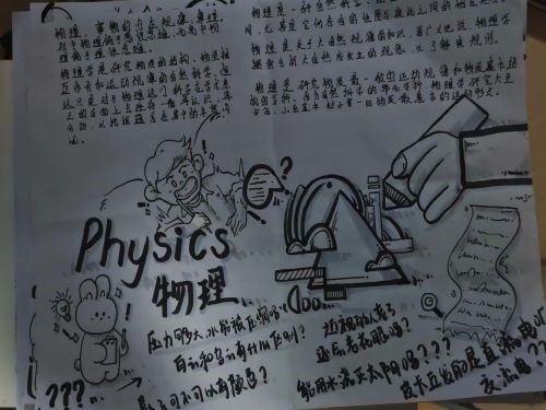 活动中,同学们积极参与和联想,把物理知识与生活紧密联系,对物理的认识具象化。手抄报内容主要由物理学识,物理与现代科技等组成,图文并茂。活动最终经社团人员评定,决出一等奖一名,二等奖两名,三等奖三名。同学们也纷纷表示感受到物理的趣味,加深了对物理的认识的同时锻炼了自己的联想能力,动手能力和表现能力。