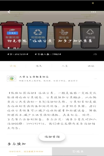 活动伊始,协会建立线上群聊将活动参与者联系起来,并发布群公告,说明活动参与方式。活动过程中,参与活动的同学积极地将竞赛答题的截图备注好,并且在群聊中上传进行打卡。活动结束后,协会对参与活动同学的竞赛成绩进行统计与审核,确定最终获奖名单,并在群聊中公示获奖名单。参与活动的同学表示本次活动促使他们对进行垃圾分类的重要性有进一步的认识。