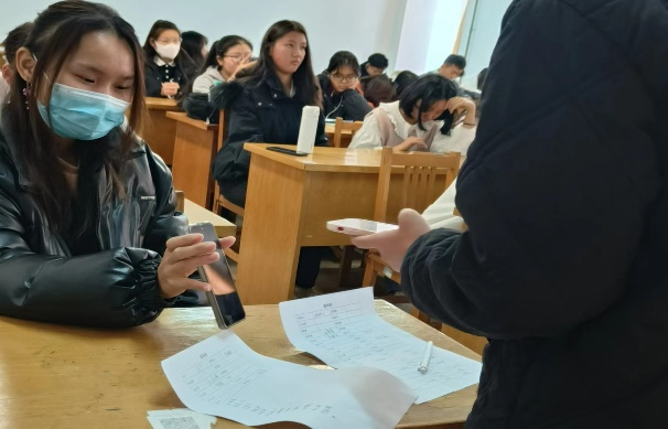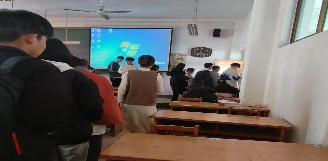 同学们进入教室,有序进行签到,等待电影开始放映。
