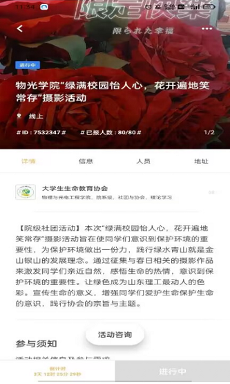 为了进一步提高学生的审美素养,增添校园生活的乐趣,使学生意识到保护环境的重要性,我院大学生生命教育协会举办物光学院“绿满校园怡人心,花开遍地笑常存”摄影活动。此次活动于4月12日至4月19日内举行,采用线上和线下相结合的方式。活动由社团会长江婉婷主持。