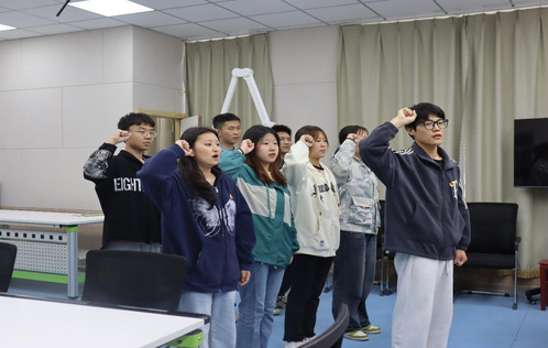 面对着鲜艳的中国共青团团旗,新发展团员王一川、于昊弘、李智贤,在郭光耀等5名优秀团员的带领下,共同举起右拳,许下庄严誓言:“我志愿加入中国共产主义青年团,坚决拥护中国共产党的领导,遵守团的章程,执行团的决议,履行团员义务,严守团的纪律,勤奋学习,积极工作,吃苦在前,享受在后,为共产主义事业而奋斗。”