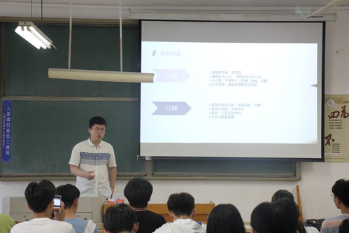 紧接着,由桑率然为大家分享他的实践经验。分享分为四个部分:报名、前期准备、实践成果、实践感悟。桑率然指出,报名时主题名字要尽量新颖,但又不要假大空。前期准备需要把各方面都商量好,如提前安排好行程,食宿、经费问题,联系好调研、支教单位、以及最重要的安全问题。实践过程中既要保留特色,又要有所创新,宣传展示工作一定要做好。