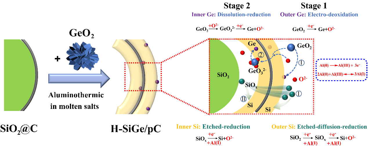 我院高培波博士及化学化工学院周晋教授研究团队基于熔融盐体系的铝热还原,实现了同构异质的中空硅/锗纳米球的可控制备。作为锂离子电池负极材料,SiGe-10%表现出优异的循环稳定性(在5A g-1电流密度下经过700次循环具有81%的保持率)和高倍率特性(在8A g-1电流密度下可逆容量高达1265 mAh g-1)。同时,作者阐明了中空异质结构的形成机制,并结合理论计算分析证明了复合材料的容量提升机制。该成果以“Heterogeneous isomorphism hollow SiGe nanospheres with porous carbon reinforcing for superior electrochemical lithium storage”为题发表在Journal of Energy Chemistry上,属中科院一区TOP期刊。