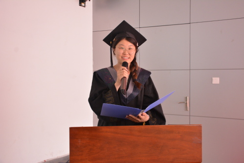 徐彩雪回首了大学四载的春秋寒暑,描绘的幕幕场景就像张张绚丽的剪纸画,串成一部即将谢幕的电影,记录着她们的青春与过往,播放着她们的快乐与忧伤,承载着她们在学院里的点点滴滴。最后,她代表全体毕业生们感谢学院领导老师们四年的辛勤裁培和谆谆教导,并祝福母校母院未来更加美好。