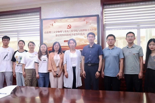 为深入学习贯彻党的二十大精神和学校第四次党代会精神,加强基层党组织建设,按照学院主题教育安排,6月19日,我院学生第一党支部与淄博第十八中学第一党支部在淄博第十八中学综合楼会议室举行党支部结对共建签约仪式。淄博第十八中学校党委书记、校长尹明哲,我院党委副书记杨晨出席,淄博第十八中学第一党支部书记王春粟,我院学生第一党支部书记张继武、物理学系主任杨兴华以及双方部分党支部成员、师范生实习指导教师、我院实习师范生代表参加。