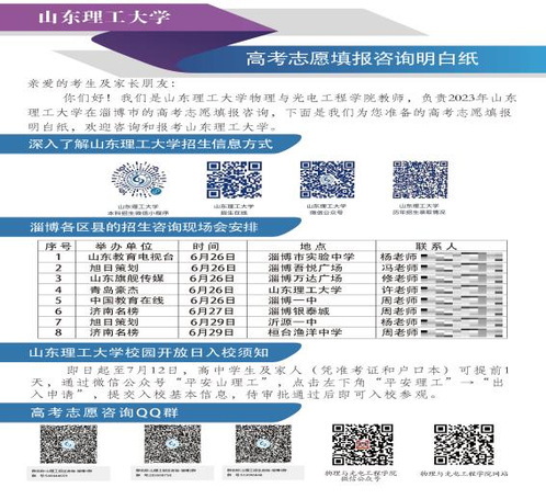 一是深化交流合作。围绕党建与业务融合发展、学科建设、师范生培养、实习就业等内容,与新建立的7所优秀生源基地进行深入交流,找准工作结合的着力点,强化合作,实现共赢。二是规定动作与自选动作相结合。除参加学校统一组织的8场高招会外,学院自主组建“东西线”“南北线”招生宣传团队,深入各区县组织山理工高考招生专场咨询会8场,实现了学院分片包干区域重点高中全覆盖。三是拓宽咨询渠道。结合实际,建立分区县的2023年招生咨询微信群、QQ群,专人负责管理运维、群内答疑。同时,学院将各教学系主任的联系方式对考生及家长公布,进一步拓宽咨询渠道。