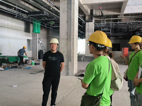 在工地内,实践团成员头戴安全帽,小心翼翼的前行,看到了头顶上方的空调管道和机身雏形,随着楼层的升高,层间距减少,如何在有限高度安装大型空调机器。随着翟经理的引导,实践团来到了顶楼,看到了位于顶楼的太阳板发电材料,虽然还没有完全安装完成,但是雏形已可见一斑,利用太阳能发电,是新能源实施的重大举措,在节能减排,绿色发展方面有巨大的作用,同时也有自然通风的窗口兼并作为太阳板发电使用。