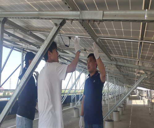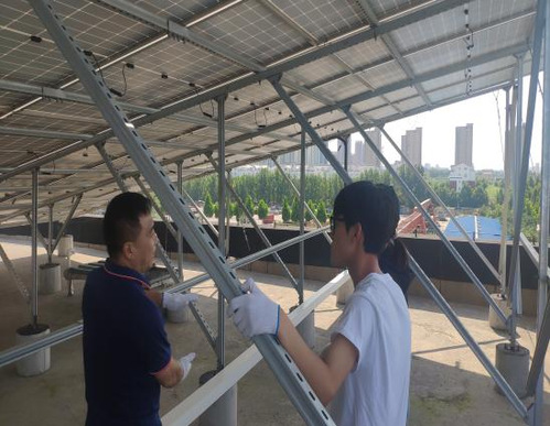 在田总的带领下,实践团队来到了屋顶进行实地观察,团队详细了解了关于发电板的倾角及朝向问题,同时,发电板还受天气因素的影响,如过高的风速可能导致光伏组件或支架系统的损坏,进而影响光伏板的发电性能等。所以在安装时,应选择合适的位置并定期检查和维护,以保持系统的稳定性和性能。