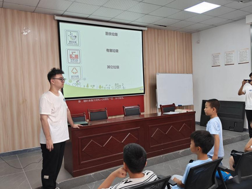 实践伊始,木槿助学团负责人李承霖在开班仪式向各位小朋友及家长们简单介绍了“魔力光伏”实践团到此的目的。首先,实践团队通过简单易懂的动画引入当天的环保主题,团队成员郑雅如结合动画从节约用水、节约用电以及垃圾分类三个方面展开交流,动画的最后,以一首垃圾分类拍手歌结尾进入垃圾分类普及小课堂。