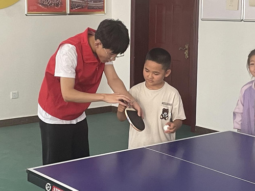 紧接着乒乓球课开始,实践团成员刘庆彪指导关于乒乓球的站姿、站位等基础动作,学生们积极学习,很快掌握了乒乓球的基础玩法。