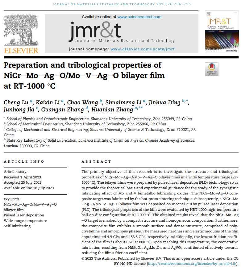Mo/V双金属氧化物的协同润滑在高温摩擦过程中起着非常重要的作用。为此,鲁成博士与其合作者研究了脉冲激光沉积制备的NiCr-Mo-Ag-O/Mo-V-Ag-O 双层薄膜的高温摩擦学性能,及其微观结构演变过程。研究结果表明,利用自制的多组分靶材及脉冲激光沉积技术制备的双层薄膜由多晶及非晶相构成,组分均匀,结构致密。在800 ℃摩擦温度下,双层薄膜的摩擦系数在NiMoO4、Ag2Mo2O7和AgVO3的协同润滑作用下降低至0.28。这些结果对高温润滑薄膜的研究具有重要意义。相关成果以“Preparation and tribological properties of NiCr-Mo-Ag-O/Mo-V-Ag-O bilayer film at RT-1000 °C”为题,发表在材料类知名期刊Journal of Materials Research and Technology上,鲁成博士为该论文的第一作者,我院为第一单位。