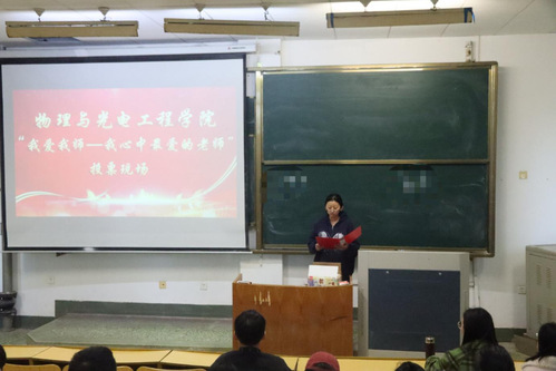 为倡导尊师重教的良好风气,展示优秀教师的师懿风范,以优良教风涵养优良学风,10月22日上午,我院在15号教学楼106教室举行第十一届“我爱我师”评选活动。此次活动由学院学生会主席团王燕主持,校学生会成员进行现场监督,各班学生代表共140人进行投票。
