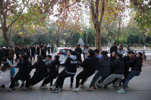 随后,参赛师生以班级或团队为单位分赴各个比赛地点开始精彩激烈的角逐。比赛设有趣味竞技赛:指压板障碍跑(翻扑克牌)、“不倒森林”、吸管接力赛、“蛟龙出海(8人9足)”、呼啦圈“过山车”、击鼓颠球(同心鼓)6项和拔河比赛。