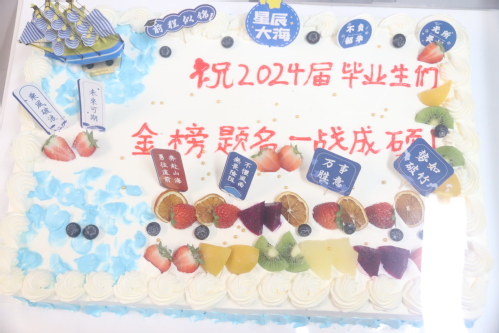 金灿灿的脐橙上面印有“金榜题名”“一研为定”的物光侠祝福图案,寓意“脐”开得胜,心想事“橙”,书写有“祝2024届毕业生们,金榜题名一战成硕”“海阔凭鱼跃,天高任鸟飞,下一站,研究生!”祝福语句的圆梦蛋糕,希望大家一举“糕”中,梦想成真!