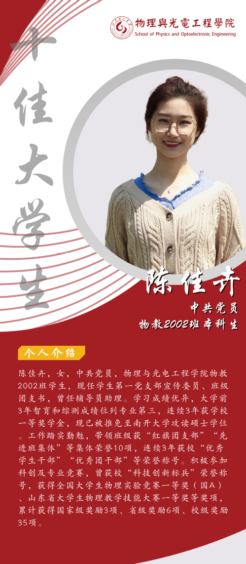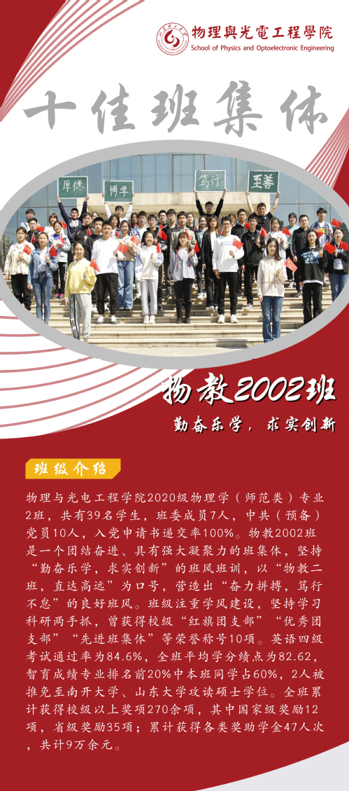踏浪前行风正劲,不负韶华争朝夕。11月30日,一年一度的十佳大学生和十佳班集体评选在学校3号报告厅如期举行,经过一下午的紧张角逐,代表我院参评的十佳班集体候选物教2002班和十佳大学生候选人陈佳卉分别以第二名和第五名的优异成绩纷纷斩获殊荣。自学院建院以来,物教2002班是继物教1701班和光电1901班后再获十佳班集体荣誉,同时首次获评十佳大学生称号,实现“双十佳”,标志着我院高质量人才培养再次取得新突破!