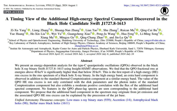 黑洞X射线双星是指由一颗恒星级黑洞与伴星恒星所组成的双星系统,由于受到中心黑洞的强引力场作用,伴星的气体会被吸积到黑洞周围构成吸积盘释放出强烈的高能X射线辐射。我院杨孜旭博士与中国科学院高能物理研究所、德国图宾根大学等机构的研究者合作,利用中国第一颗空间X射线天文望远镜Insight-HXMT (简称“慧眼”卫星)的观测数据,对于2023年8月爆发的低质量黑洞X射线双星Swift J1727.8-1613进行了详细的时变与能谱分析工作,凭借“慧眼”卫星在硬X射线波段大有效面积的国际领先优势,首次探测到了黑洞X射线双星功率谱中准周期振荡信号(QPO)的部分均方根振幅在40 keV能量以上的超出现象(称为HE-rms excess),在经过与能谱中相近能量段处发现的额外硬幂律成分性质比较之后,研究结果表明这一准周期振荡信号的振幅超出现象可能起源于黑洞周围近光速运动的喷流辐射与相对论进动产生的流量调制,该研究对于理解黑洞吸积系统中普遍出现的准周期振荡信号的起源具有重要意义。相关成果以“A timing view of the additional high-energy spectral component discovered in the black hole candidate Swift J1727.8-1613”为题发表在美国天文学会出版的致力于报道天文学快速重大进展的The Astrophysical Journal LettersApJL,中科院分区物理与天体物理1区TOP,Nature index入选期刊上。杨孜旭博士为该论文的第一作者兼共同通讯作者,我院为第一通讯单位。
