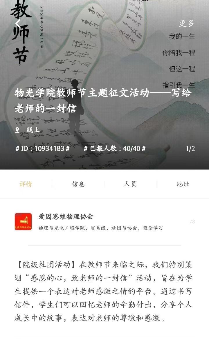 为了让学生们更多地回忆起老师的辛勤付出,同时也让学生们能够表达出内心对老师的感激之情,爱因思维物理协会于2024年9月8日至9月11日通过线上的方式举办了“物光学院教师节主题征文活动——写给老师的一封信”活动。此次活动由爱因思维物理协会负责人吴远迪主持跟进。