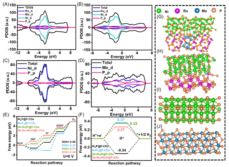 电催化水分解是一种快速高效生产氢气和氧气的技术,是未来新能源发展的重要方向。然而,当前该技术的广泛应用受到贵金属(如PtIr)高价格和稀缺性的限制。近年来,过渡金属磷化物(TMPs)及其化合物在整体水分解方面展现出巨大潜力。最近,尹广超教授团队成功制备了高效的多金属磷化物复合催化剂((Ni-Ru-MoP@F-CDs)。其在不同测试条件下均表现出优异的OERHER催化活性和稳定性。其主要原因在于:(1)三维导电金属结构设计提供了高的表面积、快速的界面间电子传输和丰富的活性位点;(2)通过界面工程诱导电子结构的再分布,优化了键强度和活性位点,并降低了水解离过程中反应的能量壁垒。这项工作为构建高活性、稳定且具有成本效益的整体水分解双功能催化剂提供了一种极为有前景的策略。
