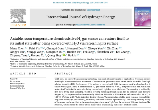 近日,我院2024届本科生陈蒙(现就读于中科院上海微系统与信息技术研究所) 在景强副教授的指导下, 以第一作者身份在国际氢能International Journal of Hydrogen Energy(影响因子8.1,中科院2区)杂志上,以《A stable room-temperature chemiresistive H2 gas sensor can restore itself to its initial state after being covered with H2O via refreshing its surface》为题报道了一项较为有意义的发现。