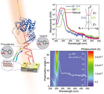 基于波长依赖的偏振探测特性,团队成功将β-Ga₂O₃偏振探测器应用于氨基酸检测。实验表明,酪氨酸和苯丙氨酸的透射光谱在236 nm与258 nm处分别呈现显著差异。通过匹配特定偏振波长,探测器可精准区分两种氨基酸,并实现溶液浓度的定量分析。该技术无需标记即可实现生物分子的高灵敏检测,为疾病诊断和生物传感提供了新思路。