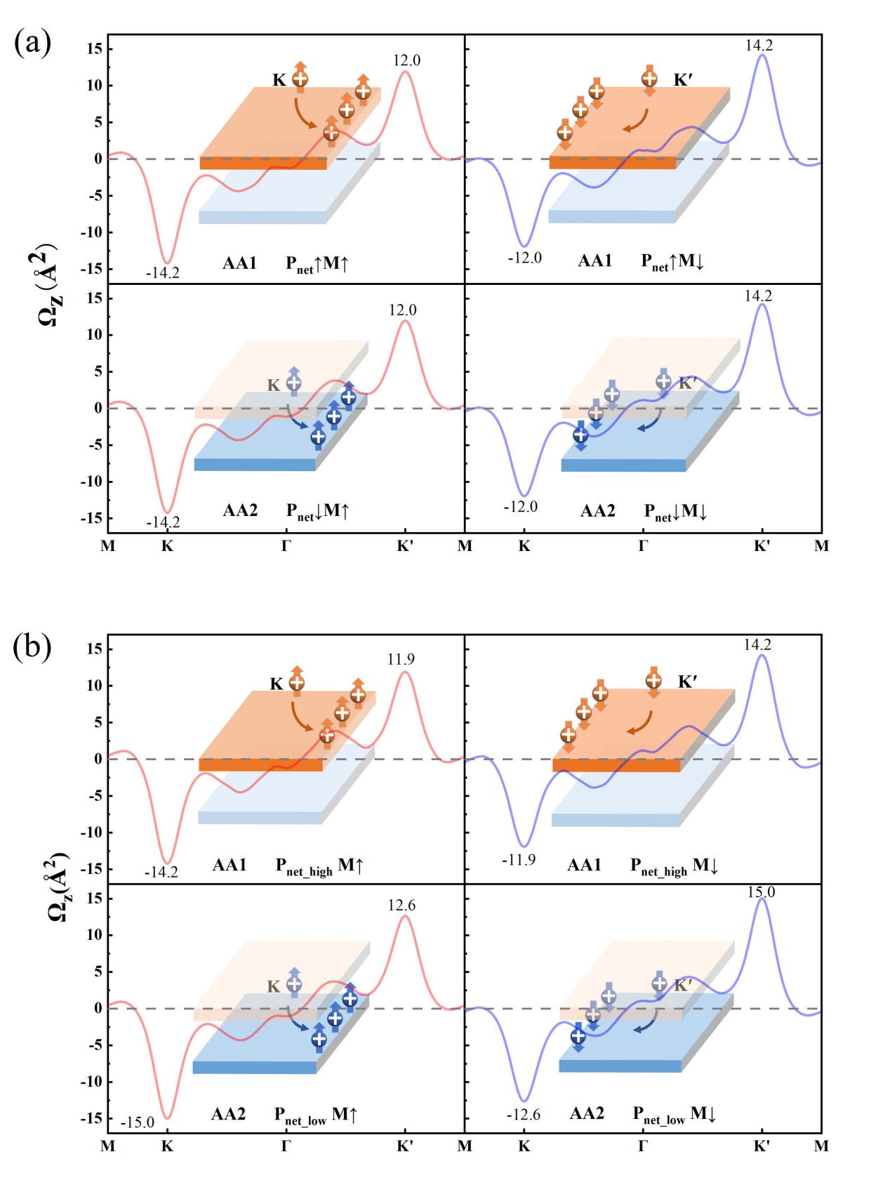 “是电子在自旋和电荷以外另一种新自由度,能够被用于数据的编码、存储和运算。操控“谷”用作逻辑运算中的信息载体是谷电子学的关键。二维六角铁谷半导体(HFVC),因为时间反演对称性破缺和自旋轨道耦合效应所以打破了KK’处“谷”的能量简并。这引起了“谷对比物理学”特征,例如,实现了贝利曲率与电子的“谷”自由度、自旋自由度之间的耦合,从而诱发了反常谷霍尔效应。而双层六角铁谷半导体更进一步耦合了贝利曲率与层自由度,从而实现具有四逻辑态的层极化反常霍尔效应(LP-AHE)。然而,缺少合适的LP-AHE材料严重阻碍了相关领域的发展。本工作利用第一性原理计算结合最大局域化瓦尼尔函数的方法证明了LP-AHE同样可以在极性HFVC双层中实现。以极性GdBrI Janus构成的双层结构为例,当界面为I-IBr-Br时,利用滑移铁电和垂直磁化的协同作用可以实现LP-AHE;当界面为I-Br时,在辅以补偿电场的条件下同样可以利用滑移铁电和垂直磁化的协同作用实现LP-AHE