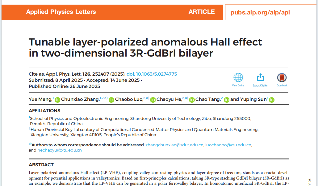 近日,我院2022级硕士研究生孟月在凝聚态物理领域取得重要进展,相关成果以“Tunable layer-polarized anomalous Hall effect in two-dimensional 3R-GdBrI bilayer为题,在自然指数(Nature Indexed)期刊Applied Physics Letters》发表。孟月为第一作者,张春小副教授为通讯作者,我院为第一通讯单位。原文链接:https://doi.org/10.1063/5.0274775