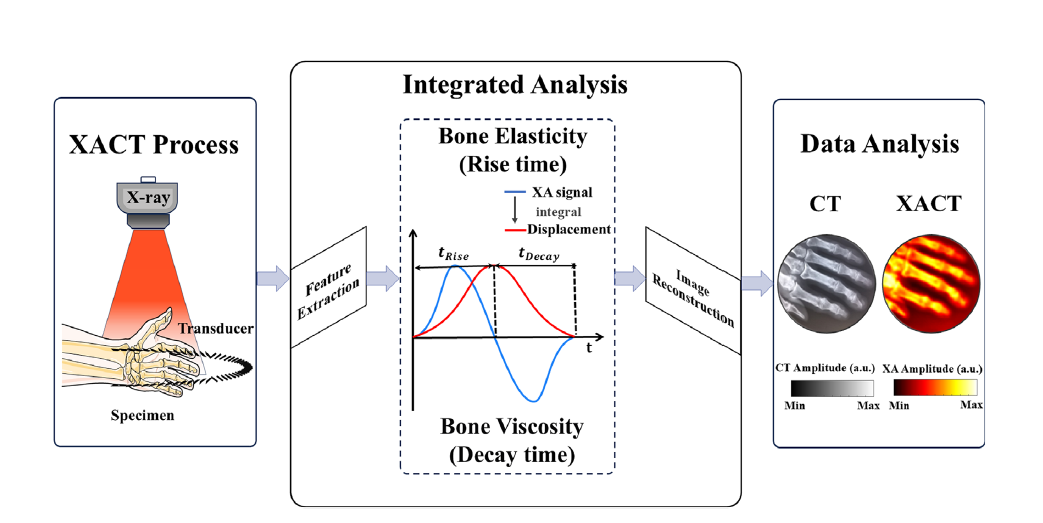 本文提出了一种基于X射线诱导声学计算机断层成像(XACT)实现骨组织弹性和粘性力学检测的新方法,通过理论建模团队成功推演出XA信号的上升时间与衰减时间与骨组织弹性和粘度之间的关系,并利用XACT清晰呈现了风湿性与正常骨组织的微观结构差异与粘弹性差异。