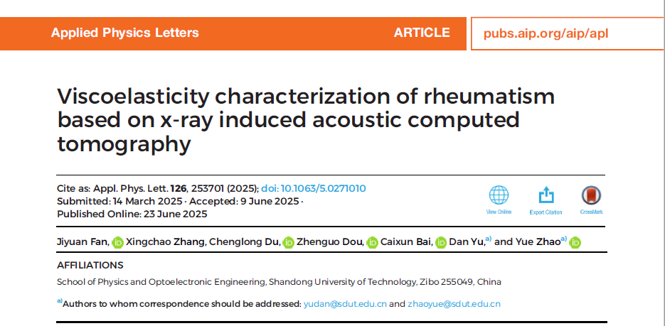 1. Viscoelasticity characterization of rheumatism based on X-ray induced acoustic computed tomography. 我院2023级研究生范继远和2021级研究生张兴超为共同第一作者,于丹副教授和赵岳副教授为共同通讯作者,我院为独立通讯单位。原文链接:https://doi.org/10.1063/5.0271010