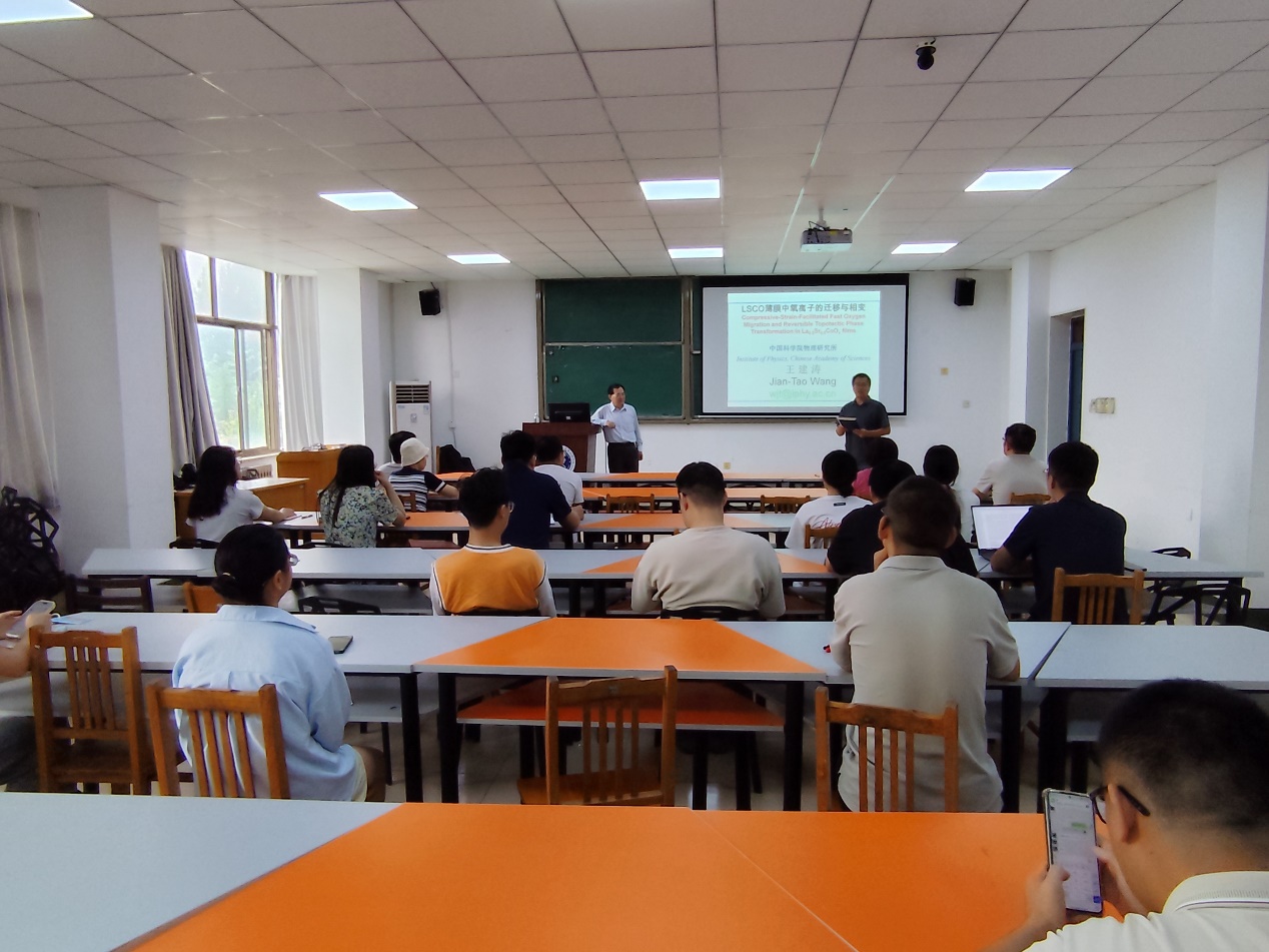 王建涛研究员作了题为“LSCO薄膜中氧离子的迁移与相变”的学术报告,从理论计算和实验两方面,讲述了LSCO薄膜中氧离子的迁移与相变机制,以及相关材料物性。此外,还在高水平论文撰写、基金申报等方面与参会人员进行了深入交流与讨论。