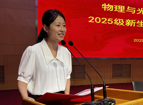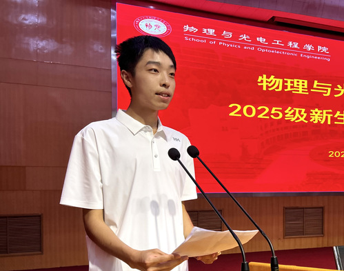 在校生代表物教2202班张琪琪同学发言。她结合自己的在校学习生活经历,鼓励同学们一要认识自己,做好规划;二要坚持学习,勇于创新;三要参与实践,创造价值。