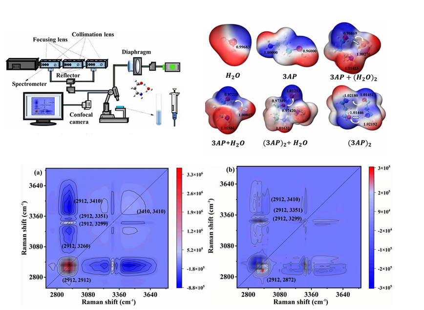 氢键网络是决定水及其溶液物理化学性质的核心因素,理解其动态行为对能源储存、生物流体及功能溶剂设计具有重要意义。3-氨基丙醇(3AP)作为一种典型双亲分子,对其在水溶液中的氢键重构机制的研究有着重要意义。我院窦振国博士利用自发/受激拉曼光谱、二维相关拉曼分析(2D Raman-COS)与密度泛函理论(DFT)计算,揭示了—NH₂基团驱动的三阶段氢键网络动态重构机制。